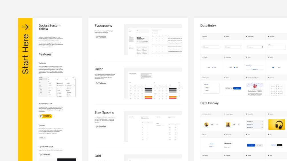 You can preview all pages and components of Design System Yellow for Figma in this file and use it to save time in your projects.